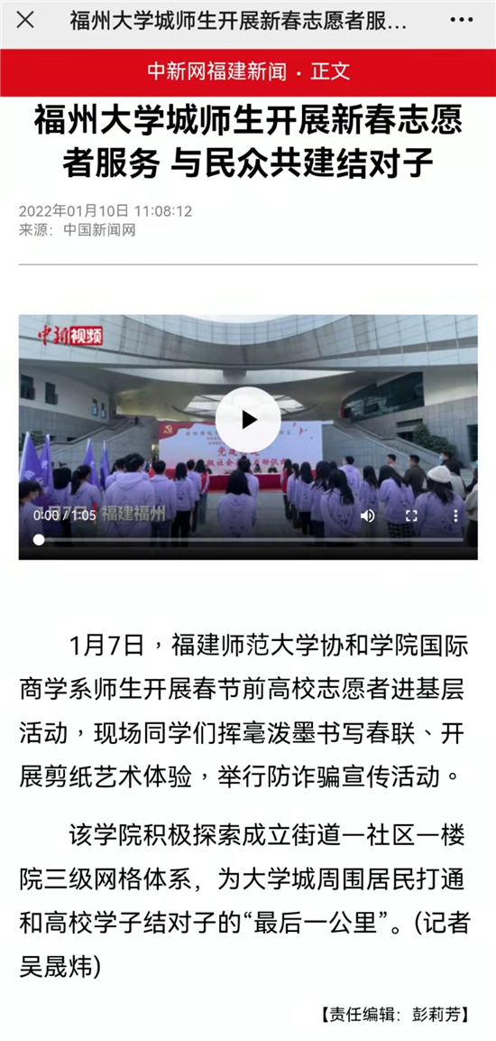 1月7日,福建师范大学协和学院国际商学系师生开展春节前高校志愿者进基层活动,现场同学们挥毫泼墨书写春联、开展剪纸艺术体验,举行防诈骗宣传活动。