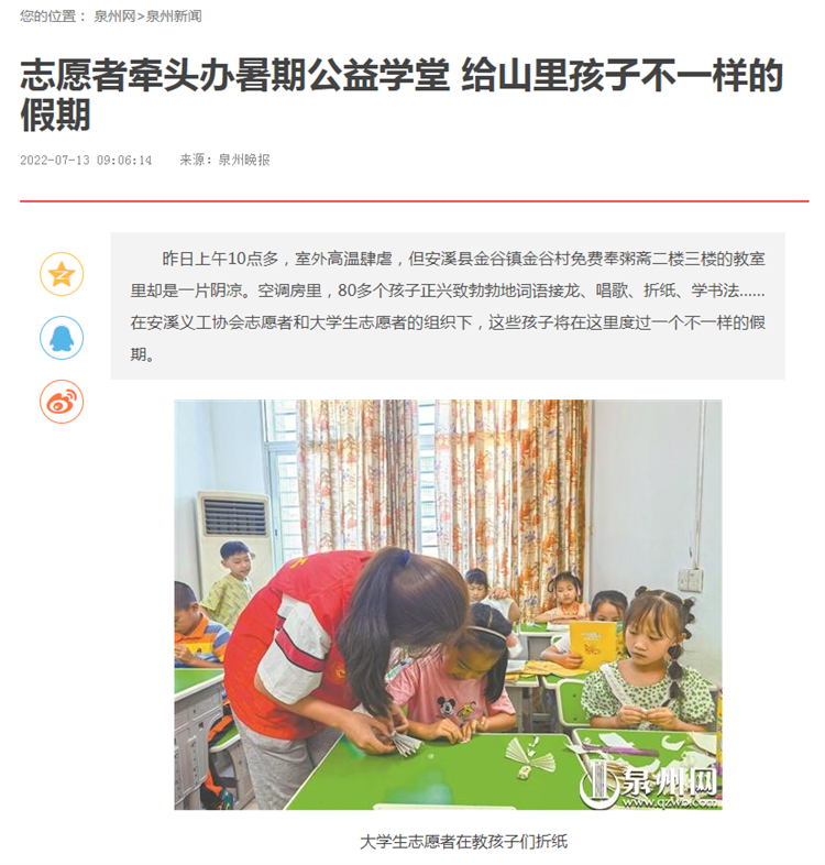 7月13日,泉州网报道福建师范大学协和学院文化产业系学前教育专业学子投身支教工作,给山里孩子不一样的假期。