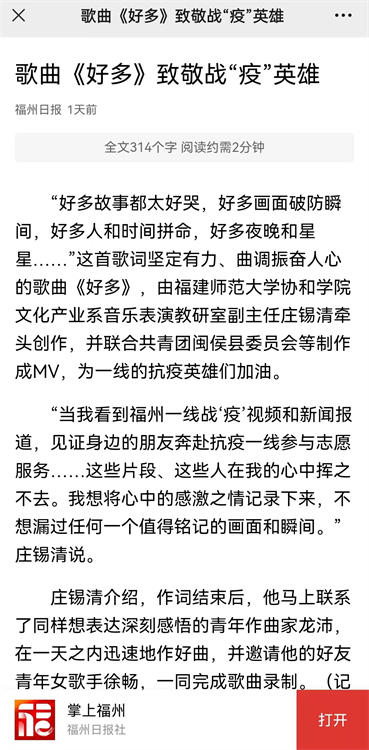 11月10日,福州新闻网报道歌曲《好多》 致敬战“疫”英雄,由福建师范大学协和学院文化产业系音乐表演教研室副主任庄锡清牵头创作,并联合共青团闽侯县委员会等制作成MV。