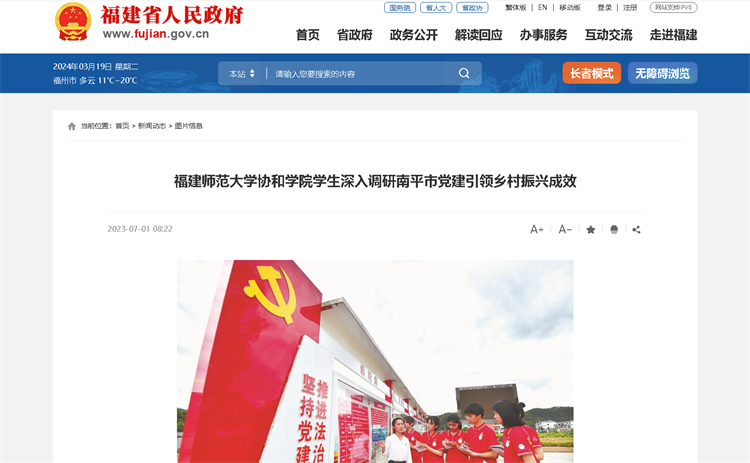 7月1日,福建省人民政府官网报道福建师范大学协和学院学生深入调研南平市党建引领乡村振兴成效。