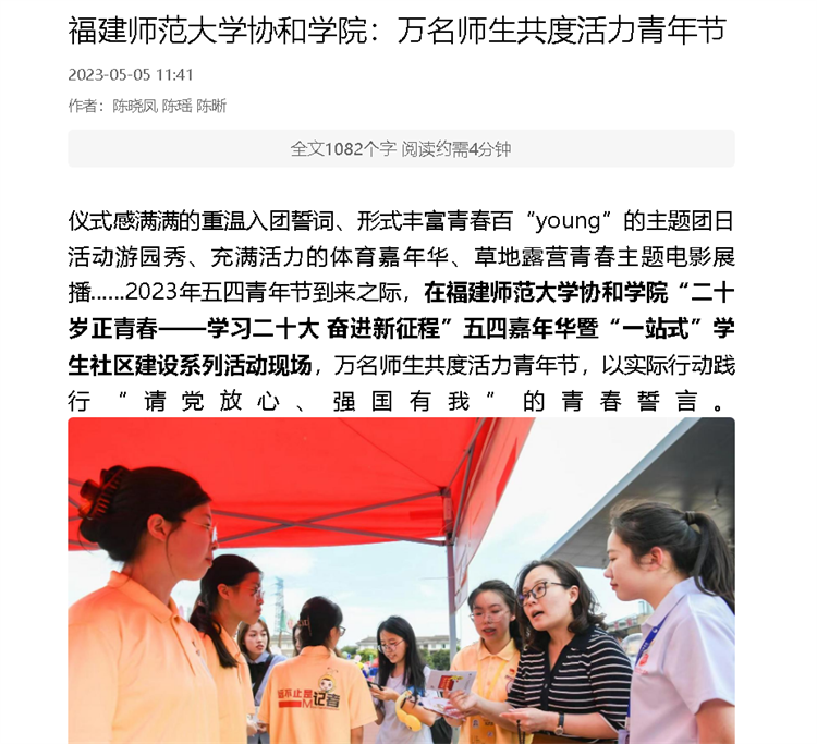 仪式感满满的重温入团誓词、形式丰富青春百“young”的主题团日活动游园秀、充满活力的体育嘉年华、草地露营青春主题电影展播……2023年五四青年节到来之际,在福建师范大学协和学院“二十岁正青春——学习二十大 奋进新征程”五四嘉年华暨“一站式”学生社区建设系列活动现场,万名师生共度活力青年节,以实际行动践行“请党放心、强国有我”的青春誓言。