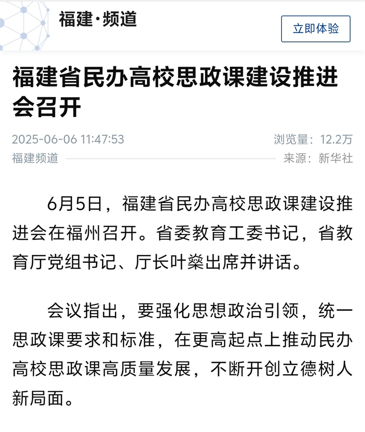 6月7日,新华社报道福建省民办高校思政课建设推进会在福州召开。