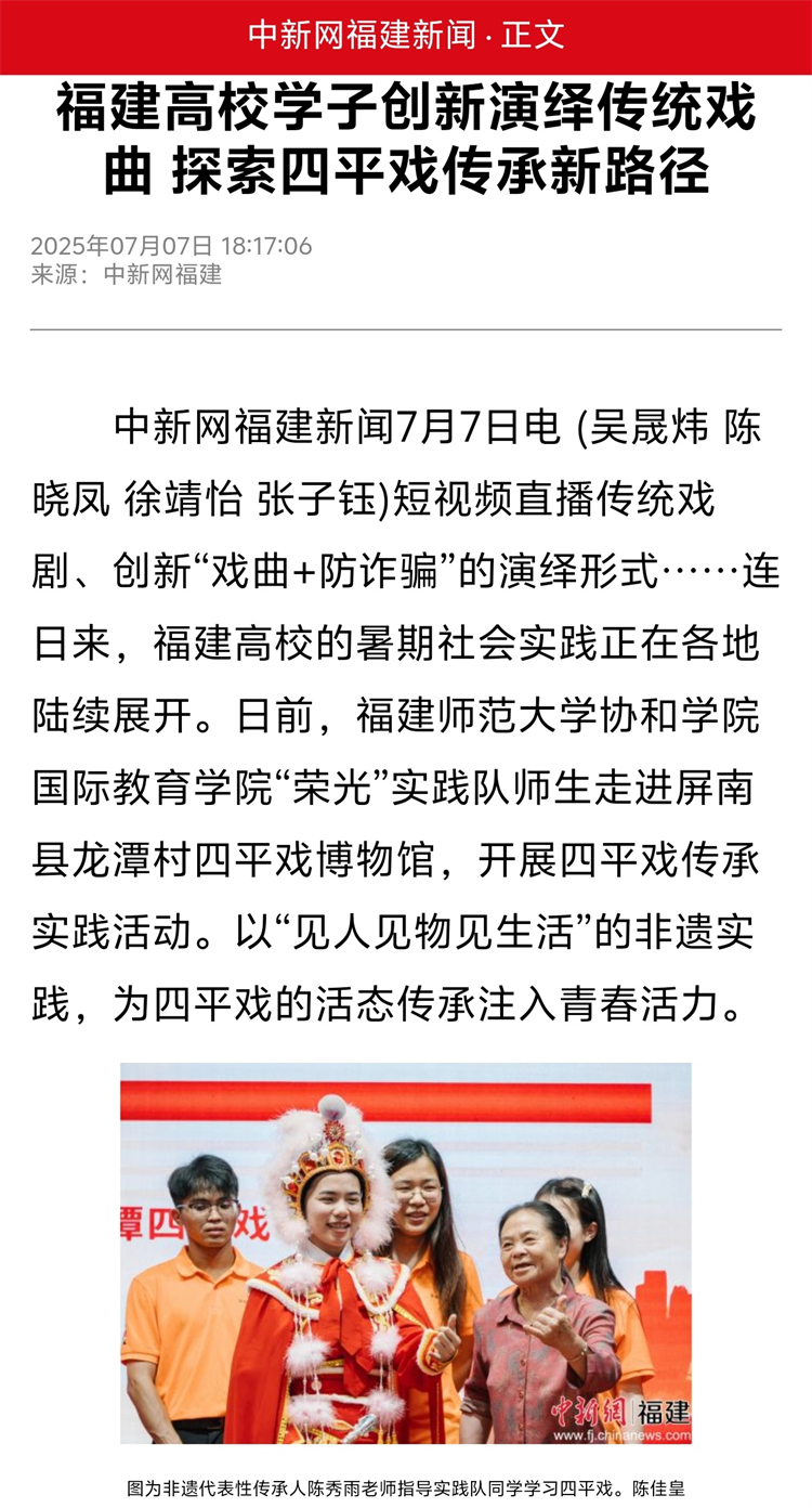 7月7日,中新网福建报道福建师范大学协和学院国际教育学院“荣光”实践队师生走进屏南县龙潭村四平戏博物馆,开展四平戏传承实践活动。