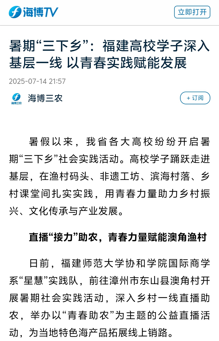 7月14日,海博TV报道福建师范大学协和学院开启暑期“三下乡”社会实践活动。在渔村码头、非遗工坊、滨海村落、乡村课堂间扎实实践,用青春力量助力乡村振兴、文化传承与产业发展。