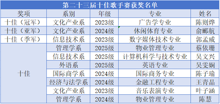 十佳歌手大赛是学院学生活动的重要品牌项目,至今已举办二十三届。经线上初选,共20名选手晋级决赛。决赛舞台灯光璀璨,选手们通过抽签顺序轮番登台,用歌声唱响青春最强音。现场气氛热烈,观众们的欢呼喝彩声此起彼伏。评委老师从多个方面对选手进行综合评分,依据分数评选出冠、亚、季军并授予前10名的选手“十佳歌手”称号。