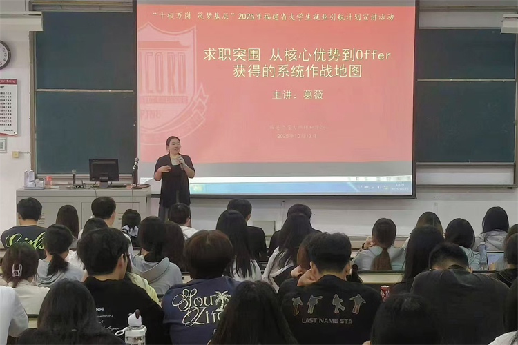 10月13日,福建师范大学协和学院国际商学系开展大学生就业引航计划宣讲,邀请人力资源管理专家葛薇为2026届毕业生作“求职突围:从核心优势到Offer获得的系统作战地图”就业指导。