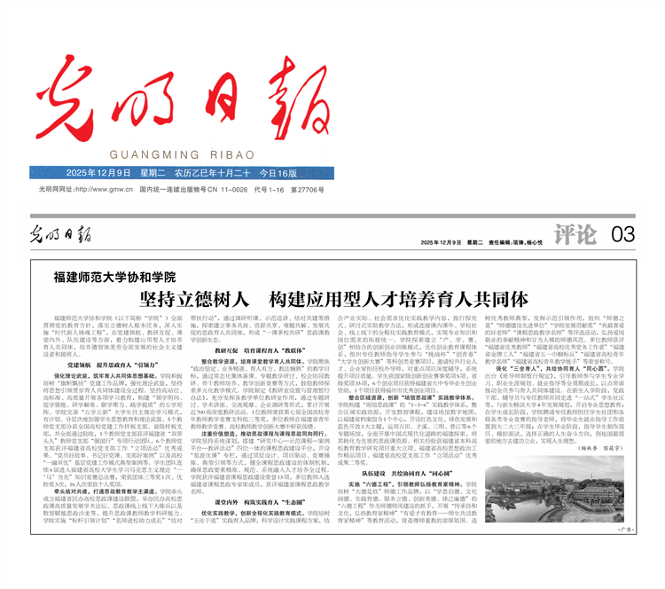 129日,《光明日报》以三分之一评论版篇幅刊发《福建师范大学协和学院:坚持立德树人 构建应用型人才培养育人共同体》专题报道,系统展示了学院在应用型人才培养方面的创新实践和显著成效。