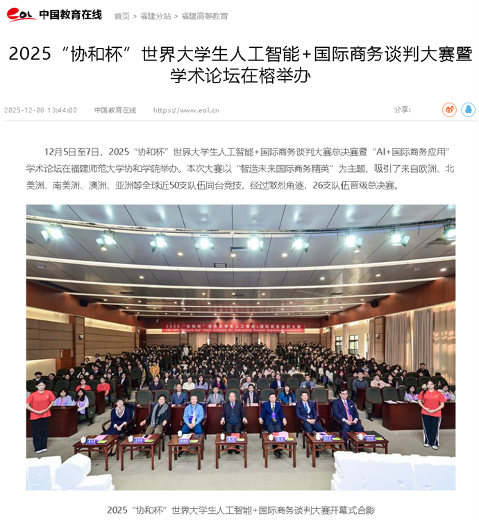 12月5日至7日,2025“协和杯”世界大学生人工智能+国际商务谈判大赛总决赛暨“AI+国际商务应用”学术论坛在福建师范大学协和学院举办。本次大赛以“智造未来国际商务精英”为主题,吸引了来自欧洲、北美洲、南美洲、澳洲、亚洲等全球近50支队伍同台竞技,经过激烈角逐,26支队伍晋级总决赛。