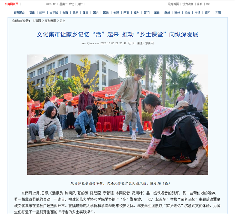 12月8日,东南网报道福建师范大学协和学院举办的“‘乡’聚星波,‘忆’起逐梦”寻找“家乡记忆”主题活动暨星波文化集市在星驰广场热闹开市。在福建师范大学协和学院22周年校庆之际,25支学生团队以“家乡记忆”沉浸式文化体验,为师生们打造了一堂别开生面的“行走的乡土实践课”。