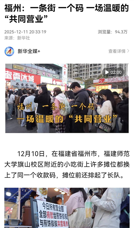 12月10日,在福建省福州市,福建师范大学旗山校区附近的小吃街上许多摊位都换上了同一个收款码,摊位前还排起了长队。