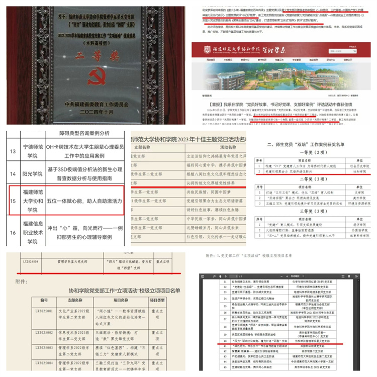 支部立足学生党支部的特点,构筑“标准引领、特色驱动”的党建工作新格局,着力锻造一支政治坚定、作风优良、能力突出的青年党员队伍。支部严格落实“三会一课”、主题党日、组织生活会等组织生活制度,确保党员教育“全覆盖、有实效”。创新实施“党员发展考察小组”制度,建立健全“成长档案—日常考评—民主评议”全链式管理机制,从严从实把好党员队伍“入口关”,确保党员发展质量。近年来,支部建设成果丰硕:《“四力”驱动文化赋能,着力打造“四型”支部》项目获福建省高校党支部工作“立项活动”优秀成果二等奖;案例《五位一体赋心能,助人自助激活力》获评福建省高校心理健康教育典型案例;案例《党建引领聚合力,双培并进促新兴》获福建师范大学“一融双优”工作案例一等奖;1个项目获院重点立项和校一般立项;1项活动获评院“十佳党日活动”。此外,党支部积极培育“三个好”工程,累计获评院级“书记好党课”2项、“支部好案例”1项、“党员好故事”1项。截至目前,在学院党务工作部网站基层风采专栏刊发报道稿30篇。