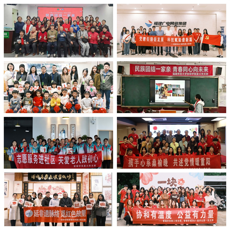 支部以思想建设为核心,构建“立体化学习、沉浸式育人”思想引领体系,持续推动理论学习常态化、长效化,引导青年党员坚定理想信念、厚植家国情怀。线上持续深化“管理红”党建品牌建设,精心策划《传承八闽根脉》《石榴籽课堂》等系列微党课,依托新媒体传播矩阵,将党的创新理论、红色语录转化为生动鲜活的影像内容;线下组织党员深入三坊七巷严复纪念馆、畲族文化馆、中国船政博物馆、螺洲古镇吴石故居及福建省革命历史纪念馆等红色教育基地,在追寻先辈足迹、感悟革命精神中推动理论学习与实践体验深度融合;联动福建师范大学法学院明德、求真第一党支部等开展党纪联建活动,搭建互学互鉴、共建共进的党建平台;聚焦民族团结进步宣传教育,广泛开展“福籽同心爱中华”系列活动,通过举办民族集市、民族歌舞晚会等形式拓宽思政教育阵地;鼓励党员主动参与各类思政竞赛,支部学生党员在福建省“一马当先”知识竞赛中崭露锋芒,获福建省福籽同心爱中华青少年学生主题演讲大赛优秀奖。在强有力的思想引领下,支部“青年大学习”学习率每期均保持100%,并在青年群体中实现“群众100%入团、团员100%申请入党”的“双百”目标,凝聚起强大的思想合力。