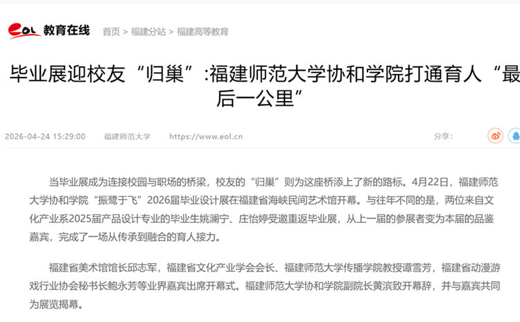 4月24日,中国教育在线报道福建师范大学协和学院“振鹭于飞”2026届毕业设计展在福建省海峡民间艺术馆开幕。两位来自文化产业系2025届产品设计专业的毕业生姚澜宁、庄怡婷受邀重返毕业展,从上一届的参展者变为本届的品鉴嘉宾,完成了一场从传承到融合的育人接力。
