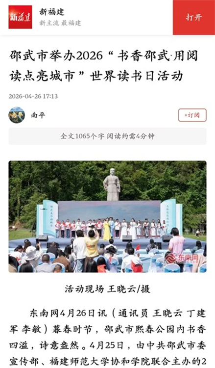 4月26日,新福建报道由中共邵武市委宣传部、福建师范大学协和学院联合主办的2026“书香邵武·用阅读点亮城市”世界读书日活动盛大启幕。邵武市阅读工作领导小组成员单位分管领导,福建师范大学协和学院领导及师生,邵武市各乡(镇)、街道党(工)委宣传委员,南平、邵武文化特派员等齐聚一堂,共赴这场书香之约。