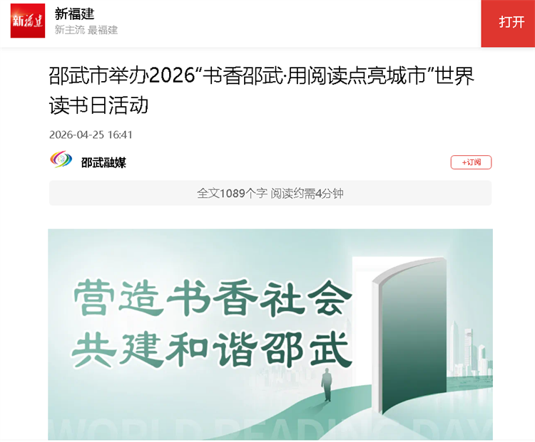 4月25日,新福建报道由中共邵武市委宣传部、福建师范大学协和学院联合主办的2026“书香邵武·用阅读点亮城市”世界读书日活动盛大启幕。邵武市阅读工作领导小组成员单位分管领导,福建师范大学协和学院领导及师生,邵武市各乡(镇)、街道党(工)委宣传委员,南平、邵武文化特派员等齐聚一堂,共赴这场书香之约。