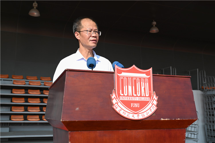 福建师范大学协和学院党委副书记、纪委书记戴文坤学生军训团五营营长,宣传部、学生事务部、教务部、院团委和各院系学生工作负责人,五营全体教官,全体2025级本科生辅导员及参训学生参加,开训式由学生事务部主任童颖娴主持。
