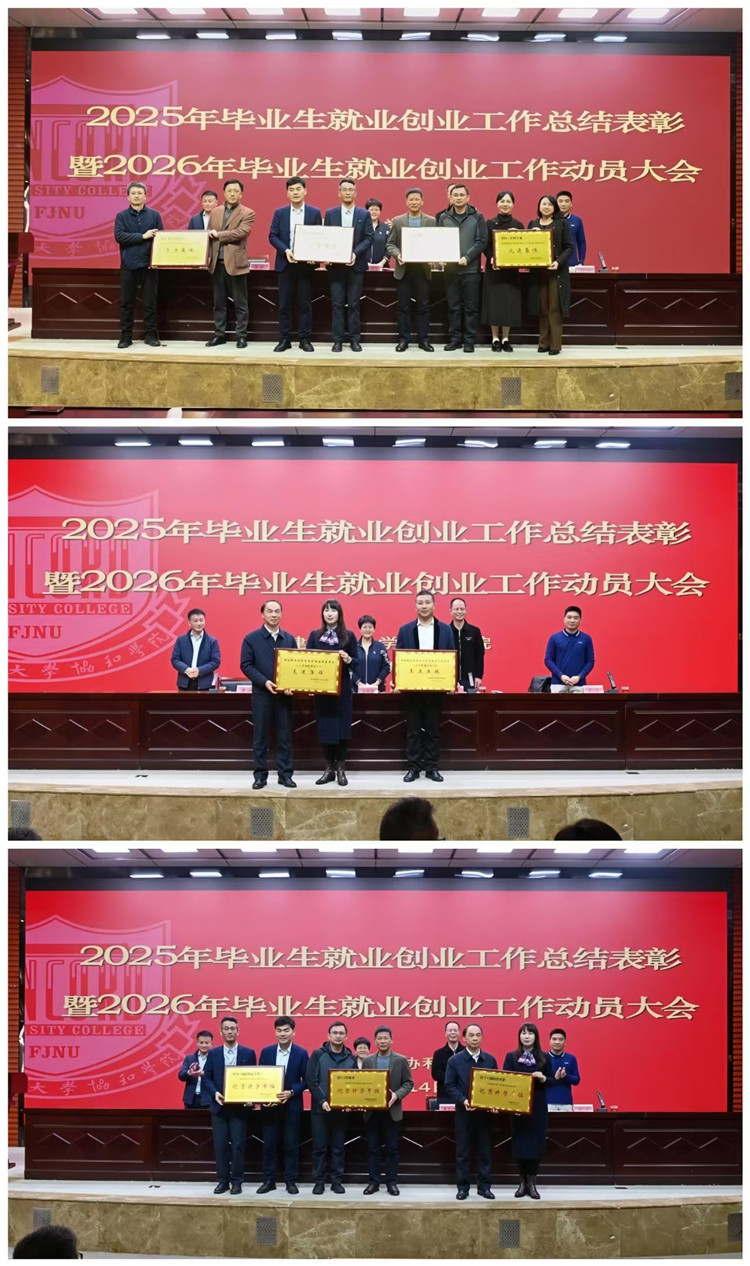 会议对2025年就业创业工作先进集体和个人进行表彰,黄滨副院长宣读《福建师范大学协和学院关于表彰2025年毕业生就业创业工作先进集体和先进个人的决定》,院领导为先进集体和个人颁发奖牌和奖状。