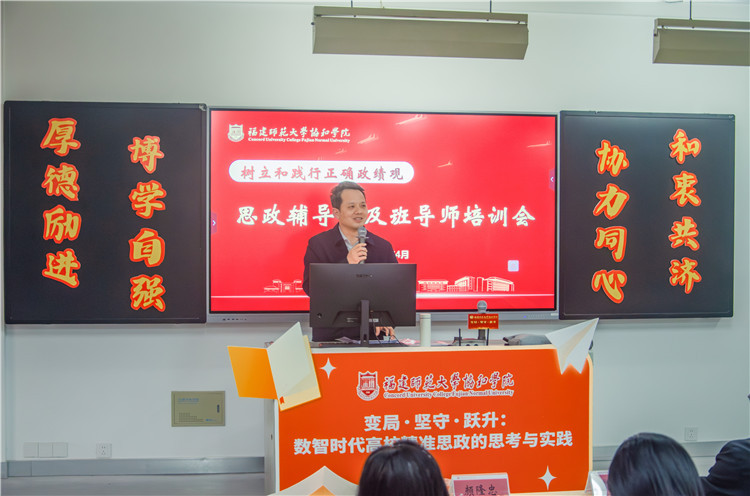 4月8日下午,福建师范大学协和学院邀请福建师范大学学生工作部(处)部(处)长颜隆忠作题为《变局・坚守・跃升:数智时代高校精准思政的思考与实践》专题讲座。讲座由院党委副书记、纪委书记戴文坤主持,教师工作部(人力资源部)、学生事务部负责人,各院系党总支书记、全体思政辅导员及2026年班导师参加学习。