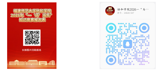采取个人报名与院系推荐相结合的方式进行选拔。各院系在学生报名的基础上,择优至少推荐15名优秀学生。个人报名及院系推荐人员于4月28日前填写《福建师范大学协和学院2026年“一‘马’当先”知识竞赛报名表》(扫描下面二维码填写相关信息),并加入协和学院2026年“一‘马’当先”备赛QQ群:246261347,相关通知将在群内发布。