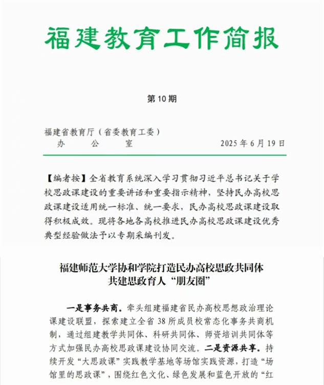 6月19日,福建省教育厅《福建教育工作简报》2025年第10期报福建师范大学福建师范大学协和学院打造民办高校思政共同体,共建思政育人“朋友圈”,推进民办高校思政课建设。