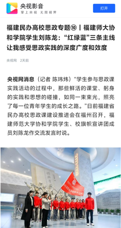 6月18日,央视网福建民办高校思政专题报道福建师大协和学院学生刘陈龙:“红绿蓝”三条主线让我感受思政实践的深度广度和效度。