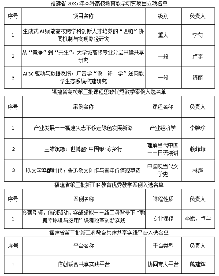 近日,福建省公布了2025年本科高校教育教学研究项目、第三批课程思政优秀教学案例、第三批新工科教育优秀教学案例和共建共享实践平台入选名单。福建师范大学协和学院获批省级本科高校教育教学研究重大项目1项、一般项目2项,课程思政优秀教学案例3个,新工科教育优秀教学案例1个、共建共享实践平台1个。