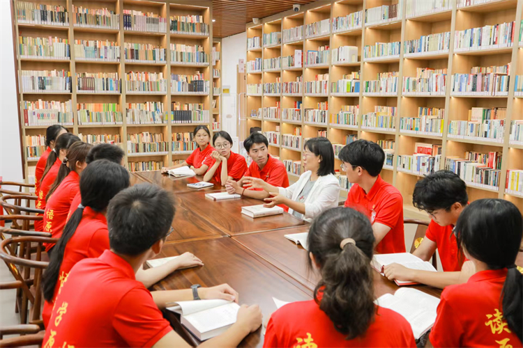 “李建平书屋”内,书屋管理办公室主任胡玲俐老师围绕书屋的功能布局、藏书规模、管理机制进行讲解,并为师生们分享了书屋建设过程中生动有趣又有意义的故事。随后,读书社同学们围绕“书香涵养青衿志 知行合一启新思”开展主题研讨活动。