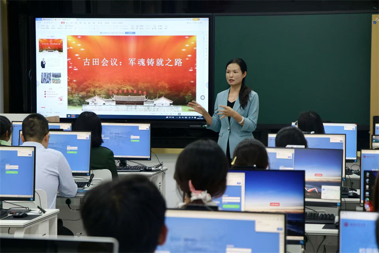 在虚拟仿真实验室,福建师范大学马克思主义学院李颖教授向师生们展示国家级虚拟仿真实验教学一流课程《古田军魂》。实验室虚拟现实技术将抽象的马克思主义理论转化为直观生动的场景,让师生们在互动中深刻理解理论的内涵与实践意义,打破了传统思政课的时空限制,更激发了师生们的学习兴趣与探索欲望。