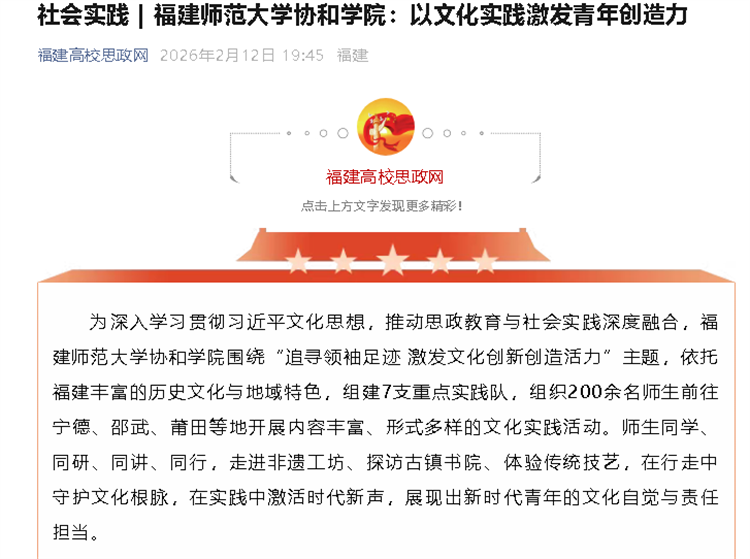 2月12日,福建高校思政网报道福建师范大学协和学院围绕“追寻领袖足迹 激发文化创新创造活力”主题,依托福建丰富的历史文化与地域特色,组建7支重点实践队,组织200余名师生前往宁德、邵武、莆田等地开展内容丰富、形式多样的文化实践活动。