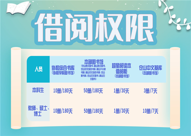 ②借阅前请仔细检查书籍是否有破损、污渍,并及时向工作人员说明。③按时归还,避免逾期。如果未在借阅期限内归还图书将收取滞纳金(第一个月0.1元/本/天,第二个月开始0.2元/本/天,缴费方式为微信或者支付宝)。