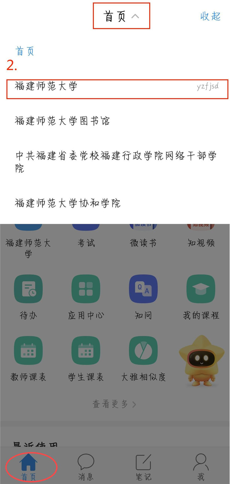 首先打开学习通,进入学习通首页,点击最上方首页,选择“福建师范大学”。
