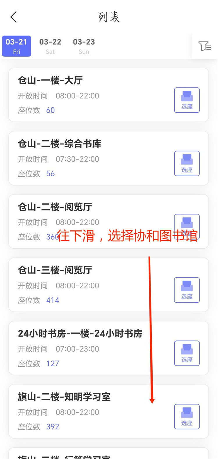 进入“预约选座”,就会出现很多选择,往下滑,选择“协和学院图书馆”即可。