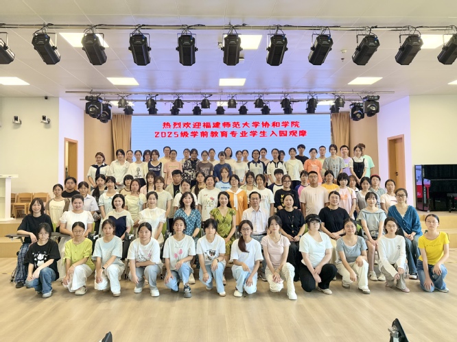 为帮助学前教育专业新生深化职业认知、厚植教育情怀,9月12日,文化产业系主任伍明春、系党总支书记许琛、学前教育专业教研室主任刘晓琛和辅导员曾滢,率2025级学前教育专业全体新生赴福建师范大学实验幼儿园(旗山园区),开展沉浸式入学教育活动。