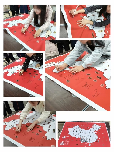 活动伊始,支部组织全体团员集中学习民族政策与少数民族分布知识。借助图文资料与互动讲解,支部团员系统了解了民族区域自治制度的深刻内涵与各民族共同发展的历史脉络,进一步夯实了维护民族团结的思想根基,促进大家在互动体验中深化对国家民族政策的理解,凝聚团结奋进的青春力量。随后,支部成员结合专业特长,分组协作绘制中国少数民族分布图。大家精心标注聚居区域,粘贴特色文化标识,在一笔一划、一贴一粘中,生动呈现出中华民族多元一体的格局。随着地图逐渐丰富,民族团结的理念也从抽象走向具象,成为可触可感的视觉画卷。绘制完成后,支部成员以接力形式,共同书写“民族大团结”五个大字,不同笔迹凝聚起同一份信念,展现了青年一代对民族团结的坚定承诺。