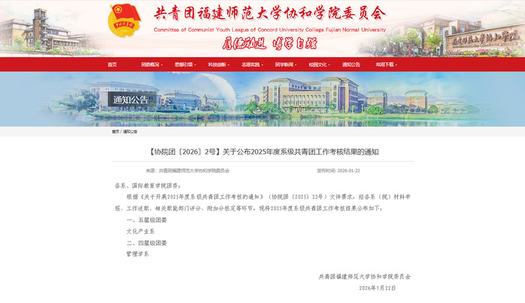 1月22日,院团委公布2025年度系级共青团工作考核结果。经各系(院)材料申报、各系(院)团委书记(负责人)述职、相关职能部门评分、附加分核定等环节,文化产业系团委获评福建师范大学协和学院2025年度系级共青团工作考核“五星级团委”称号。