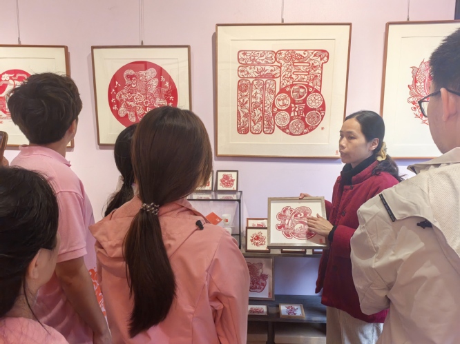 活动首站,支部党员走进福建民俗博物馆,近距离观摩寿山石雕刻等非遗精品,感受八闽传统技艺的匠心巧思与闽地深厚的人文底蕴。随后,支部一行来到福建省非物质文化遗产博览苑。在剪纸非遗展区,专业老师现场讲解了福建浦城剪纸的技法特色与民俗寓意,学生党员近距离欣赏剪纸艺术的灵动韵味,沉浸式感受福建剪纸非遗的独特魅力。此外,支部成员还参观品鉴了漆画等非遗佳作,领略福建漆艺的精湛工艺。