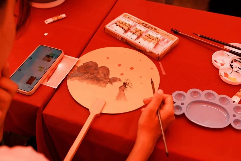 “至扇至美”板块中,一席纸,一方绢,今日且作丹青手。低头凝神,外语系的同学们手握毛笔,细细勾勒出团扇上自己喜欢的纹样。团扇,团扇,它不仅有着超越千年的历史底蕴,还饱含了丰富的寓意“吉祥美好,团圆友善”。