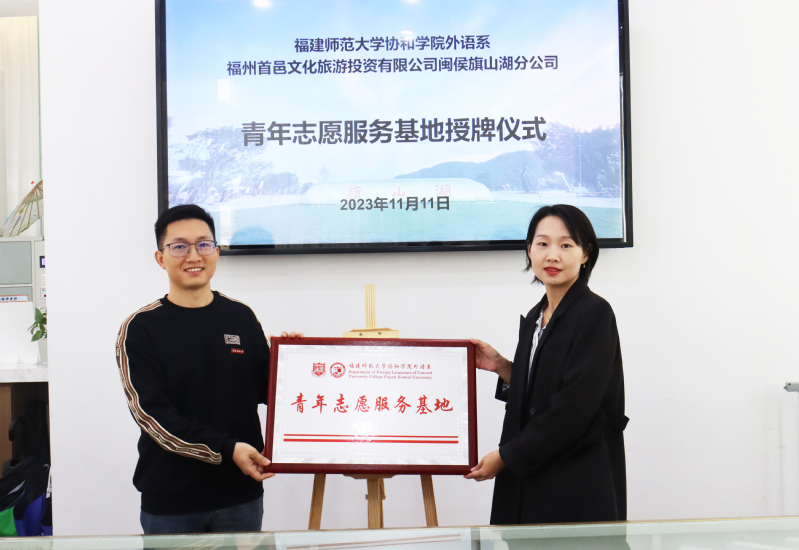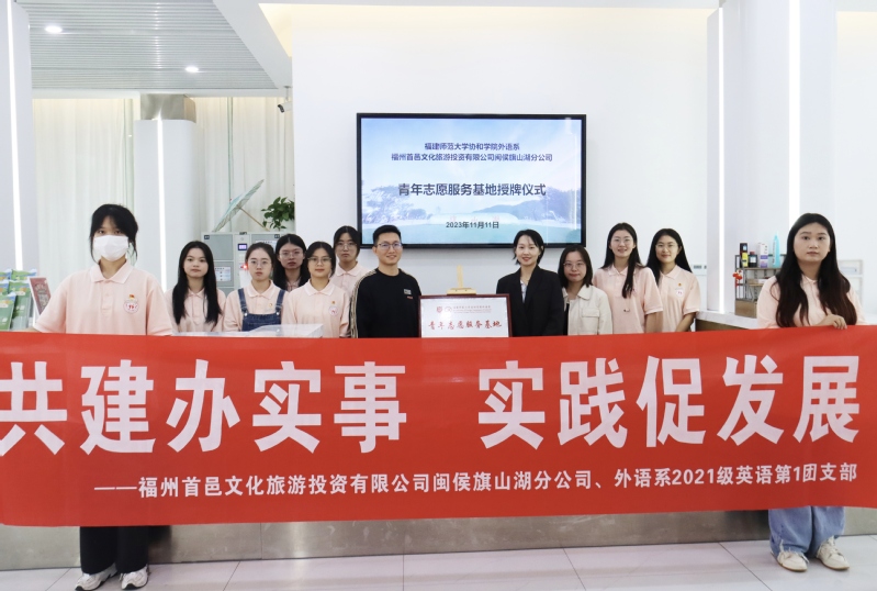 为深入学习贯彻党的二十大精神,深入贯彻团中央团员和青年主题教育部署,11月11日上午,福建师范大学协和学院外语系与福州首邑文化旅游投资有限公司闽侯旗山湖分公司举行青年志愿服务基地授牌仪式。
