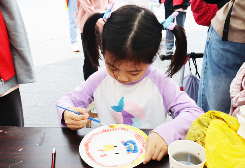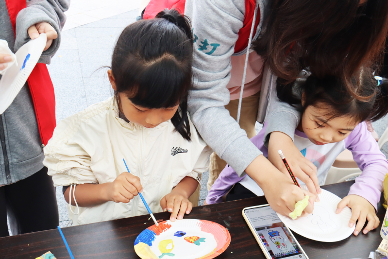 授牌仪式结束后,外语系2021级英语第1团支部开展“童心守护,万物循环”环保主题活动。活动现场,支部成员向市民游客们宣传生态文明理念,增强全民生态环境保护的思想自觉和行动自觉,并邀请孩子们来到摊位前参与“瓶子改造diy”、“扭扭棒diy”和“纸盘绘画”等生动活泼的劳动体验课程,让孩子亲自动手、亲身体验、自我感悟,让“绿水青山就是金山银山”的理念早早植入孩子的心灵。