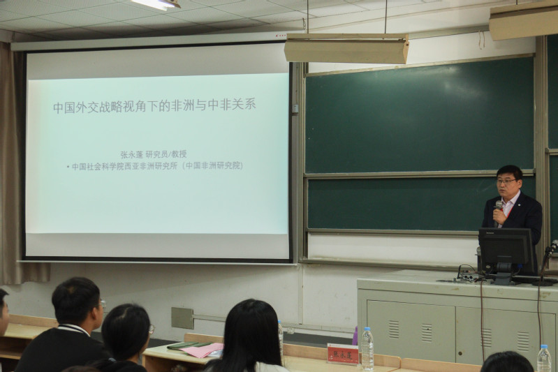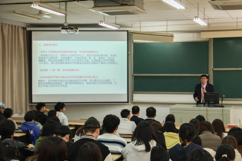 张永蓬教授以中国式现代化的主体内容作为切入点,阐述中国式现代化是以人民为中心,实现人民生活水平、物质文明和精神文明大发展以及人与自然和谐共生的扎根中国国情的现代化。他指出中国式现代化离不开和平的国际环境,随着中国式现代化不断取得新的成就及其世界性示范意义的不断凸显,中国与全球南方国家的合作越来越成为大国博弈的重要组成部分。中国与全球南方合作将代表全球最广泛的和平、发展利益,将在国际治理、构建国际新秩序和推动可持续发展领域发挥引领作用。最后,张永蓬教授将目光定格在全球南方的重要地区——非洲区域上,简单地介绍中非合作历史和“一带一路”框架下的中非合作,阐明中非合作是发展中国家间相互支持、携手共赢的典范;非洲区域国家将在中国国际战略和未来世界经济中心扮演极其重要的角色,中国式现代化必将为促进世界和平发展做出更大贡献,为构建高水平中非命运共同体描绘百花齐放的现代化新图景。讲座结尾,张永蓬教授通过分享自己在非洲的所见所闻和当地的人文交流。在随后的互动环节中,面对学生提出的跨国就业薪资概况与有无相关跨国工作建议的问题,张永蓬教授热情、详细地解答现场听众提出的问题。