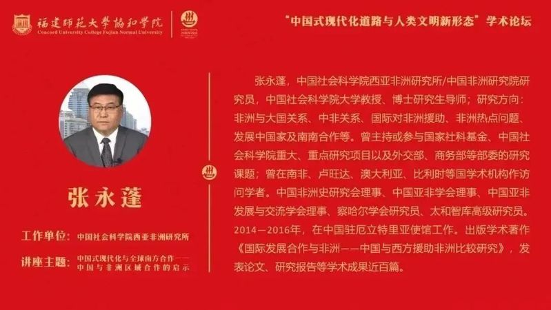 2023年11月26日上午,福建师范大学协和学院举办“中国式现代化道路与人类文明新形态”论坛,此次活动是学院20周年校庆学术日的系列活动之一。论坛期间,外语系邀请中国社会科学院西亚非洲研究所研究员、中国社会科学院大学张永蓬教授为全系的师生做《中国式现代化与全球南方合作——中国与非洲区域合作的启示》的学术讲座。讲座由外语系主任张昌宋教授主持。