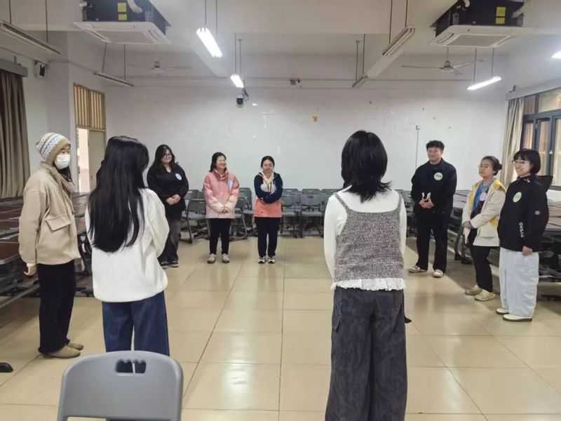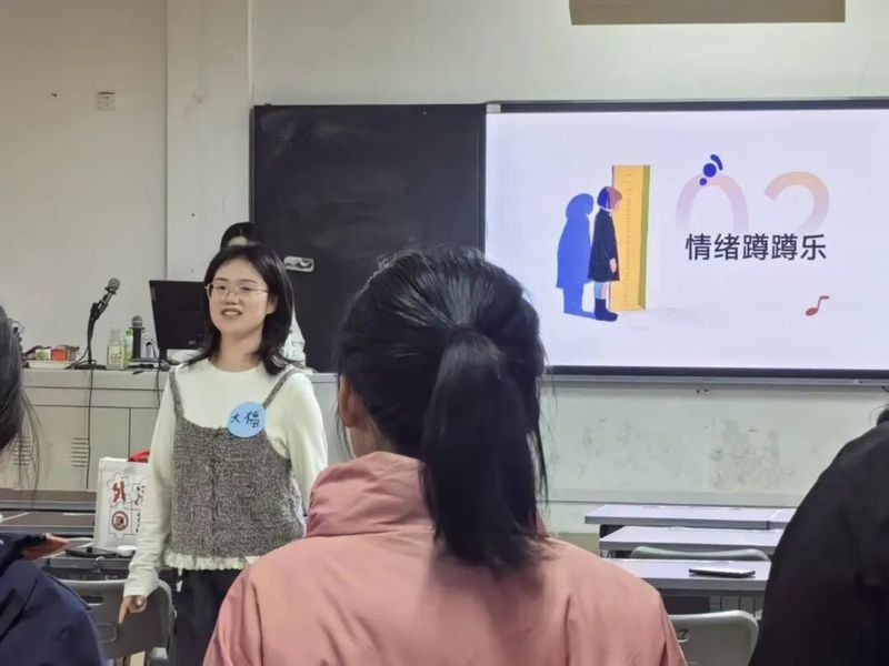 活动开场,邱婧怡以轻松的自我介绍打破陌生感,拉近与同学们的距离,并带领同学们签订“尊重、开放、保密”的团体契约,营造了安全、互信的活动氛围。在核心体验环节,邱婧怡设计了一系列兼具趣味性与疗愈性的互动游戏。在“情绪蹲蹲乐”环节,同学们一起喊着口令,边做表情动作边完成接力,在欢声笑语和肢体互动中直观感知不同情绪的外在表达。在“情绪猜猜猜”环节,各组代表抽取卡片演绎情绪成语,搭档表演与台下抢答交织,“手舞足蹈”的演绎让现场氛围持续升温,同学们在“猜与演”中学会了捕捉情绪的细节信号。