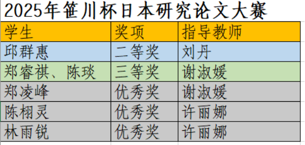 近日,全国高校日语专业本科生“2025年笹川杯日本研究论文大赛”全国总决赛获奖名单公布。外语系学子共获得了文学组二等奖1项、三等奖1项、优秀奖3项,3名老师获优秀论文指导教师奖。