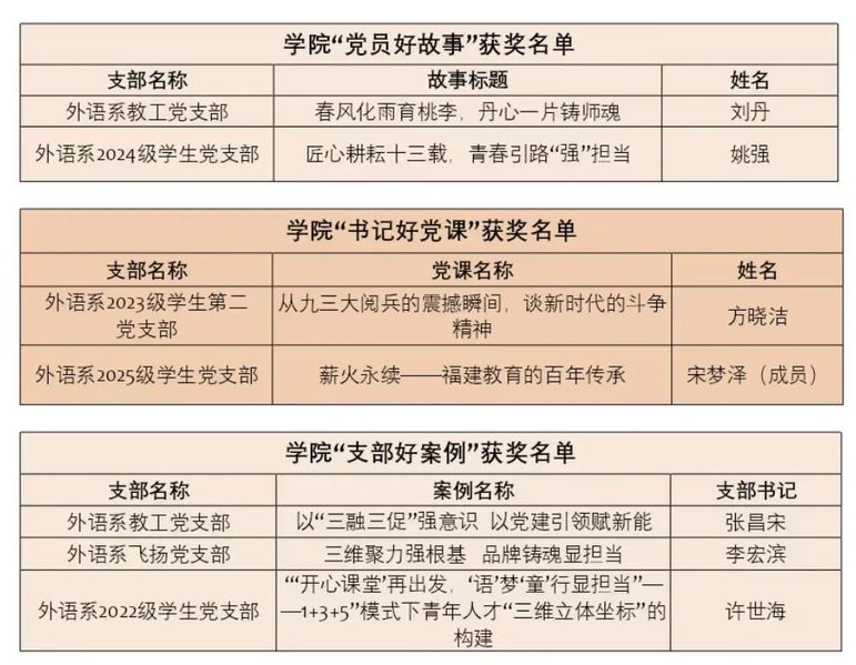 近日,福建师范大学协和学院党委组织部公布了“党员好故事、书记好党课、支部好案例”的获奖名单。其中,外语系2个支部在“党员好故事”中获奖;2个支部在 “书记好党课”中荣获表彰;3个支部在“支部好案例”获评优秀案例。
