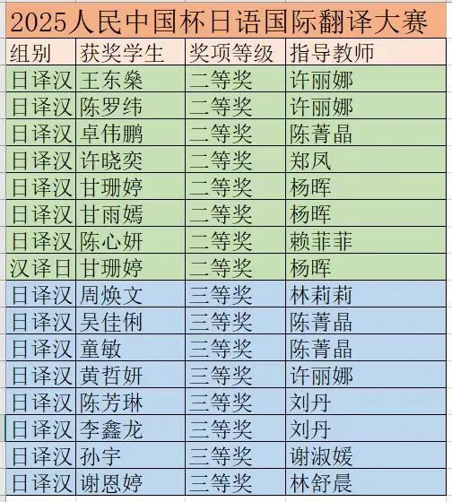 近日,第八届“人民中国杯”日语国际翻译大赛获奖名单正式公布。外语系师生广泛参与,在日译汉、汉译日组别中表现优异,共斩获二等奖8项、三等奖8项,展现出我系学子扎实的专业能力和出色的跨文化素养。
