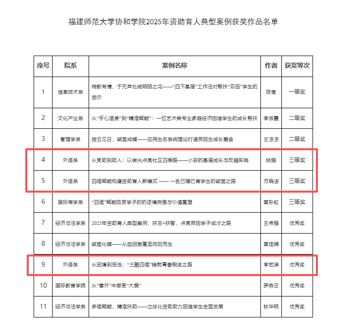 近日,福建师范大学协和学院学生事务部公布了2025年资助育人典型案例获奖作品名单。外语系姚强、方晓洁老师的案例获三等奖,李宏滨老师的案例获优秀奖,充分彰显了外语系在资助育人工作中的扎实探索与显著成效。