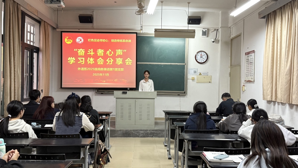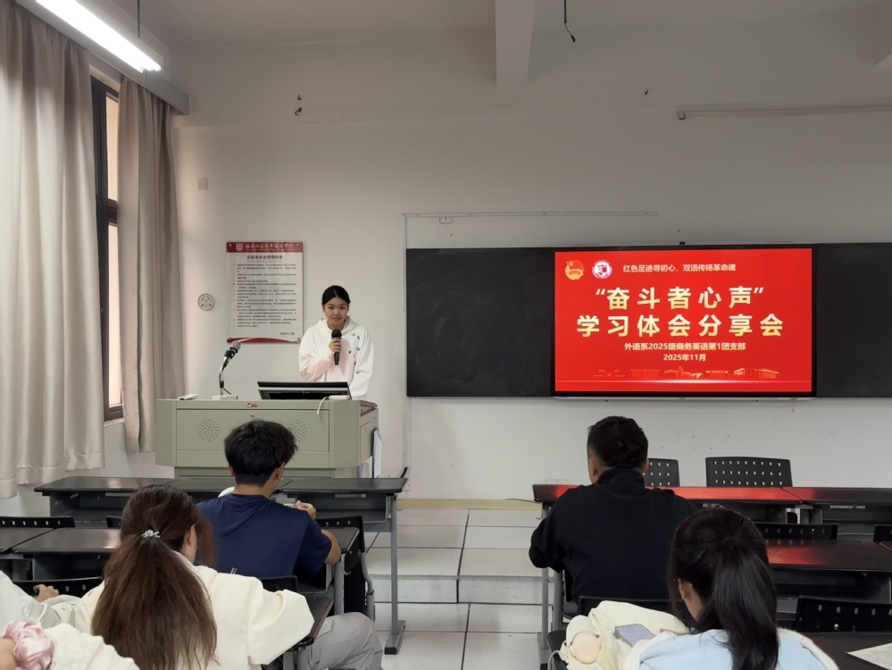 为深入学习传承红色精神,深化青年团员对中国革命史的认知,坚定“听党话、跟党走”的理想信念,11月31日,外语系2025级商务英语第1团支部“奋斗者心声”学习体会分享会顺利召开。本次分享会是团支部系列红色学习活动的收官之举,此前团员们先后开展新四军驻福州旧址寻访、“强国担当”专题讲座、专题研讨等活动,在沉浸式学习中感悟革命初心,在交流分享中凝聚奋进力量。