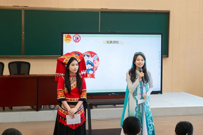 课堂上,志愿者们充分发挥外语专业特色,创新融入双语环节,用简单的外语词汇搭配中文解读,向同学们介绍国家安全相关的基础表述,既传播了国安知识,也激发了同学们的外语学习兴趣。同时,活动特别融入民族团结教育内容,来自外语系2024级英语专业的壮族学生黄丽青和日语专业的回族学生丁昭莹身着本民族的特色服饰,依次分享。黄丽青详细介绍了壮锦服饰的刺绣工艺、色彩寓意,讲解了壮族三月三、铜鼓文化等传统习俗;丁昭莹则结合服饰的款式特点,科普了回族的文化禁忌、传统节庆等内容,用生动的讲述让同学们感受不同民族的文化魅力,引导大家树立“中华民族一家亲”的理念,明白民族团结是国家安全的重要组成部分。此外,志愿者们还设置“国安知识小擂台”“情景模拟小剧场”等互动环节,围绕“照片不任意拍”“信息不非法传”等守护国家安全“八个不”要求,引导同学们积极抢答、主动参与,在轻松愉快的氛围中加深对国家安全知识和民族团结理念的记忆。