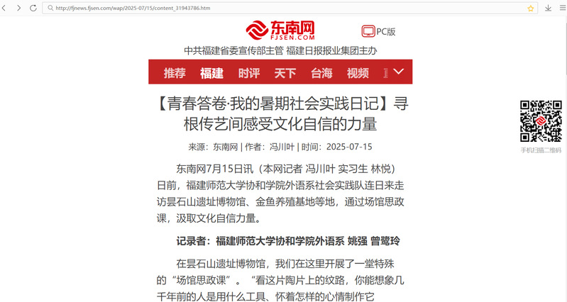 东南网7月15日讯(本网记者 冯川叶 实习生 林悦)日前,福建师范大学协和学院外语系社会实践队连日来走访昙石山遗址博物馆、金鱼养殖基地等地,通过场馆思政课,汲取文化自信力量。 记录者:福建师范大学协和学院外语系 姚强 曾鹭玲 在昙石山遗址博物馆,我们在这里开展了一堂特殊的“场馆思政课”。“看这片陶片上的纹路,你能想象几千年前的人是用什么工具、怀着怎样的心情制作它吗?”该校马克思主义学院雷媛媛老师的发文引发了我们的思考。“以前在课本上看到‘新石器时代’感觉很遥远,”队员小陈表示,“但今天亲眼看到这些带着新石器居民‘指纹’的陶片,觉得历史活了!”“雷老师说这是文化的‘源代码’,是自信的根,”队员小李说,“我一下子就体会到了那种沉甸甸的分量。感觉像给我们的文化基因做了一次深度‘扫描’。也更明白作为外语专业学子,向外传播时背后的底气从哪里来。” 第二站,我们来到潘氏金鱼养殖基地。一池池碧水中,色彩斑斓、形态各异的金鱼优雅游弋,瞬间点燃了我们的热情。“哇!快看这条,真的像熊猫!”“这个头上顶着‘皇冠’!”队员们兴奋地指着水中精灵。省级非遗“福州观赏金鱼培育技艺”传承人潘师傅向队员们详细介绍了“熊猫蝶尾”“皇冠珍珠”等特色品种的培育技艺。 “原来养鱼不仅是技术活,更是艺术活,”队员们感叹道,“是几百年传下来的‘指尖功夫’!更可贵的是,这门手艺还成了村里的‘致富密码’。我们一边拍照一边讨论:谁说传统没市场?这“水中牡丹”游出了新路子,乡村振兴的密码,原来就藏在老祖宗的审美和匠心里。 我们实践的最后一站来到旗山文城社区。在这里,我们和三十多位社区小朋友齐聚一堂。这一次,我们要扮演的是文化的使者。 我们把这几天的所见所闻讲给小朋友们听。我们跟小朋友讲昙石山的故事,讲金鱼怎么变成‘艺术品’。看着他们好奇的眼神、开心的笑脸,突然觉得,这几天晒的太阳、流的汗,值了!我们把古老的故事、精湛的手艺、伟大的精神,用我们能想到的最有趣的方式,‘种’进下一代的心田里。 |