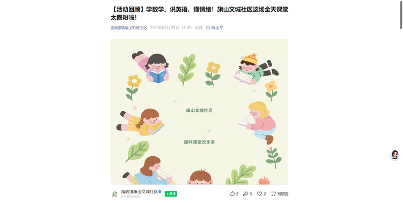 此次全天制趣味课堂将学科学习、情绪教育、艺术创作深度融合,内容丰富、形式生动,深受孩子与家长好评。下一步,旗山文城社区将持续深化校地共建,整合优质资源,推出更多惠民趣味活动,全力护航青少年健康成长。
